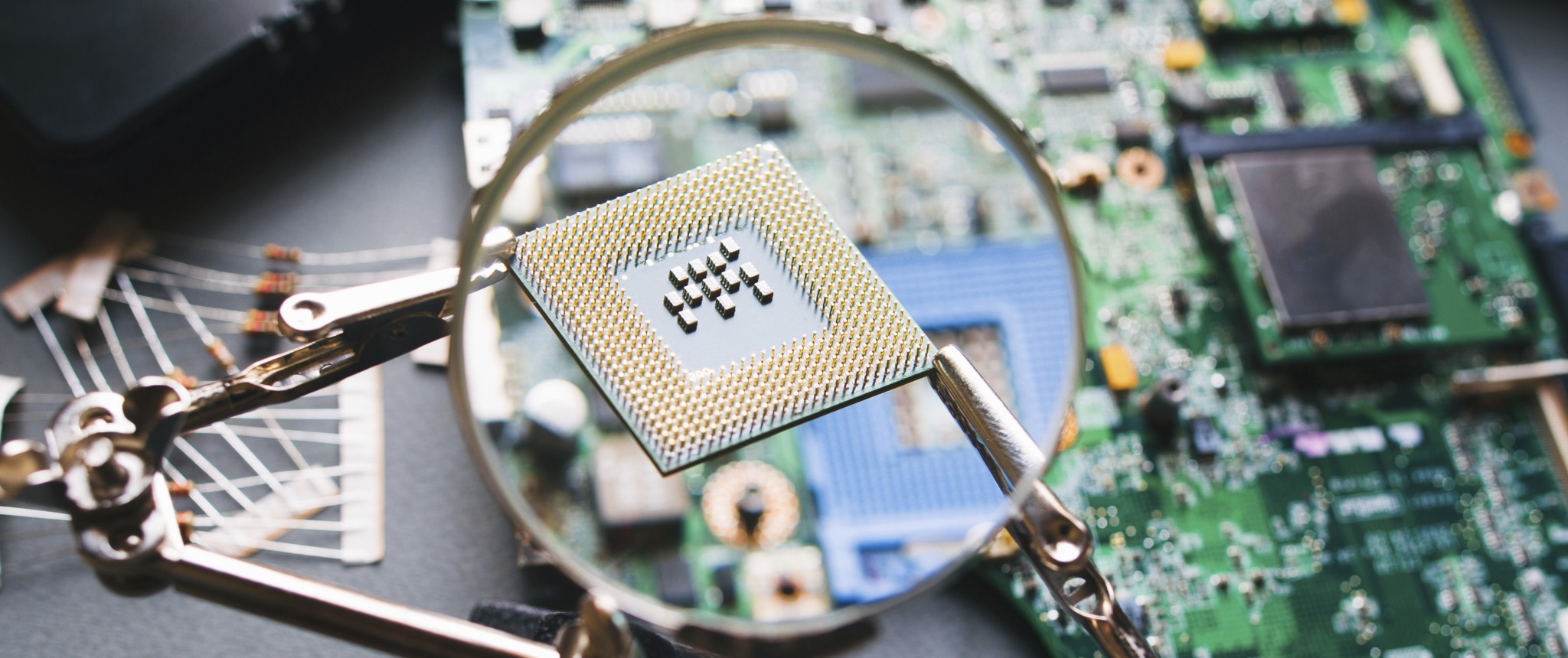 Premium AI Image | Closeup of microchips and circuits under m…